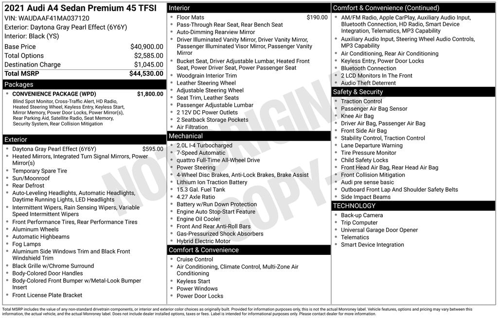 ⢠Convenience Package, offering advanced technologies like Parking System Plus, Audi Side Assist, and a Heated Steering Wheel