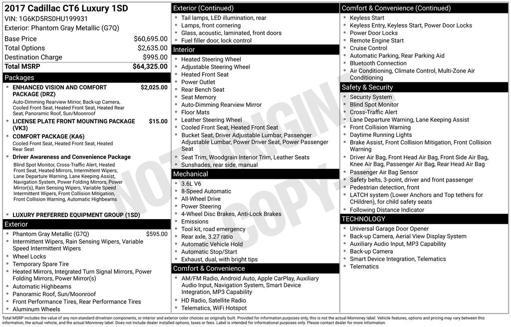 Powered by a robust 3.6L V6 engine and equipped with an 8-Speed Automatic transmission and All-Wheel Drive, this CT6 delivers an exceptional driving experience. With an EPA-estimated 18 MPG in the city and 27 MPG on the highway, you'll enjoy the perfect balance of performance and efficiency.