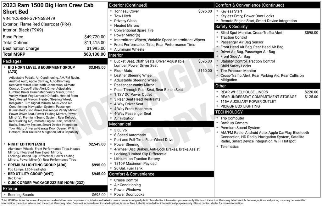 Powered by a robust 3.6L V6 engine and equipped with 4-wheel drive, the 2023 Ram 1500 Big Horn/Lone Star delivers exceptional capability and efficiency. With a towing capacity of up to 12,750 pounds and a payload capacity of up to 2,300 pounds, this truck is ready to tackle any job, whether it's hauling heavy equipment or conquering the great outdoors.