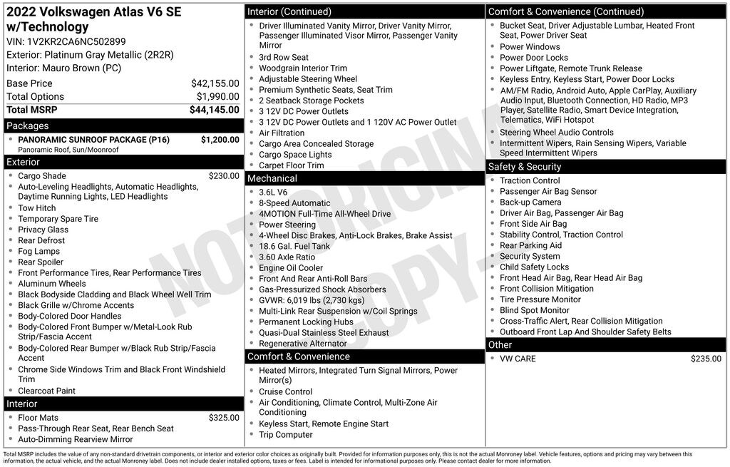 (Warning- a little long) We were looking for a roomy 3 row SUV with easy access to all 3 rows. After a ton of research and multiple test drives of the possible options, we settled on the VW Atlas, SEL Premium. We’ve owned our Atlas for a little over a month now. We’ve taken it on a couple of long trips (1000+ miles), so we’ve seen enough to write a decent review. The Atlas was one of 4 finalists for us. The others were the GMC Acadia, the Chevy Traverse, and the Infiniti QX60. These were our finalists for one primary reason- access to the rear seat with car seats installed in the middle row seats (without climbing into the middle row, and going through the middle space between the captain’s chairs). No other 3 row SUVs had this option, although I understand some will have it for the 2020 model year. Because we only had 4 models to look at, we focused all our attention on these models. Likes: Third row access is incredibly easy in the Atlas. By pulling up on the release on the top of the seat, the entire seat tips forward, and then slides forward, leaving a large opening to access the rear seat, and allowing us to buckle our 4 year old into that seat very easily, even while standing outside the car. This middle row seat movement can be performed with a car seat installed in the middle row seats, a maneuver that very few 3 row SUVs are capable of. The Infiniti QX-60 has a similar setup, and it is just as easy to use. The Acadia and Traverse also have this option, but during our test drives, we found the mechanism to be incredibly difficult to use. The salesman said it was probably just stiff, but it was almost impossible for my wife to get the seat to move, and it happened in both of those models. Also, the GMC and Chevy only have this capability on the passenger side, which is highly annoying. The interior of the Atlas is HUGE, the door openings are very wide to provide easy access, and it is very comfortable. The seats in the Atlas were by far the most comfortable of any vehicle we tested. When I say that, I mean ALL of the seats, to include the 2nd and 3rd rows, and the 3rd row is actually usable by adults. I am 5’10”, and I was very comfortable back there. I would not say the same of the other three vehicles tested. Also, the middle row seats of the Chevy and GMC were very uncomfortable. The had a weird shape, with a weird forward “hump” that hit right between the shoulder blades. I’m sure this has something to do with crash safety or something like that, but those seats were just extremely uncomfortable. Our Atlas is equipped with a panoramic sunroof, which is pretty cool. It also has a power sunshade for the sunroof. The Chevy and GMC have a very cheap, manual cover. It is spring-loaded, and if you accidentally let go of it, it will snap back like a window shade. At this price level, it should be a power sunshade. While we are on the topic of sunshades: the 2nd row windows in the Atlas have built-in sunshades, which is ingenious! I wish all cars had this feature. The Atlas has an infotainment system that is easy to use and intuitive, and it allows for swiping and pinch zooming. Apple Car Play is awesome! Surprisingly, some manufacturers have not integrated this feature at this time. The digital instrument panel has a very nice, modern look, and it offers 5 or 6 different views. One of the really cool things about the Atlas- you can display the nav map in the middle of the instrument panel. Additionally, you can make the map bigger and the gauges smaller, which allows you to see more map detail- a really nice option. The car even has an altimeter, which is really cool to me (I’m a pilot by trade). Not so much for my wife… The Atlas allows for 4 customizable driver settings. It also has an overhead view camera, which allows you to see a birds-eye view of the vehicle- very handy to ensure you are actually centered in that parking spot! (this is only offered in the highest trim level) The car also has a traditional shift lever. This appeals to me, because I’m old school. The Atlas has a very nice exterior, and it looks great from both the front and the back. The LED headlights are really nice, and much brighter than standard headlights. Also, the daytime running lights look really cool (I noticed that when another Atlas pulled up behind us on the freeway). It also has a small turn radius, which makes maneuvering in tight spaces much easier. The Atlas has a few other really nice options- adaptive cruise control, auto-dimming headlights, auto-wipers, and an auto-park feature (highest trim level only) for parallel and back in perpendicular parking. The cruise control also has an option to speed up or slow down in increments of 5 mph in addition to the more standard 1 mph increment, which is handy. It also has a feature that turns on the fog light on the side of the car in the direction of a turn, providing extra light for making the turn safely. You can also lock the middle row seat HVAC controls, to prevent the inevitable arguments from the kiddos! One of the best things about the Atlas is the industry leading warranty- 6 years/72k miles, bumper to bumper. Very few of the competitors even come close to this. And it is manufactured in the USA, which I really like. Now let’s talk about the things I don’t like about the car. (And believe me when I say these things are pretty minor in the grand scheme of things…) The biggest gripe I have is the engine power. Given that my primary goal with this vehicle is to comfortably get a lot of people from point A to B, this isn’t a huge deal. I didn’t buy this car to qualify for the Indy 500, but I do wish VW offered some different engine options, like a V-8 or a turbo V-6. They do offer a turbo 4 cylinder, but it is not offered above the base trim level, and I don’t think it is anything more than adequate for this car anyway. A close 2nd for cons would be the height of the front seat armrests (on the door side of each